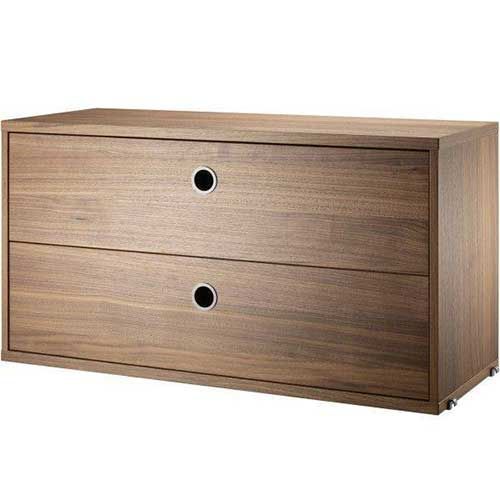 Dit is de Kast met twee lades 78x30x42 cm van String. De kast heeft een breedte van 78 centimeter en een diepte van 30 centimeter. De kast is leverbaar in zes varianten: wit MDF, grijs MDF, zwart MDF, berken, walnoot en eikenhout.