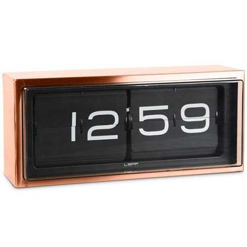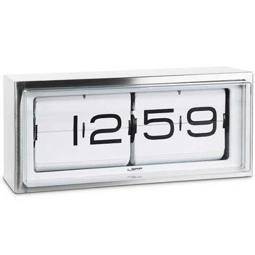 De Brick RVS 24h klok lijkt er altijd al te zijn geweest. Hij heeft de vintage uitstraling van klokken uit vervlogen tijden. Het is een flip-over model dat iedere minuut in beeld wil brengen. Je kunt de klok neerzetten of aan de wand hangen. De Brick RVS 24h klok van LEFF is er in wit of zwart en is gemaakt van roestvrij staal. Sinds 2014 is er een derde variant beschikbaar met een koperen behuizing.